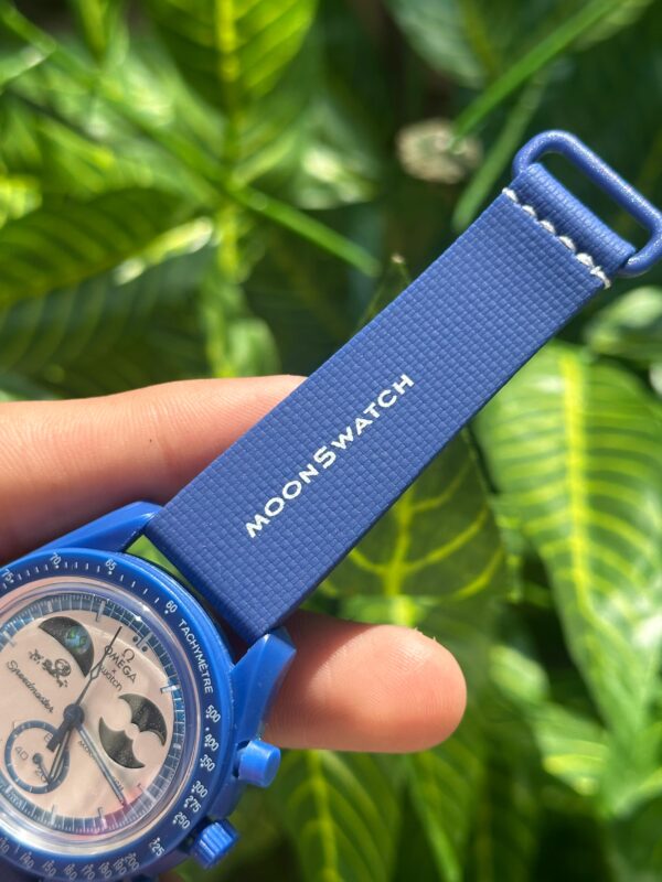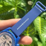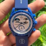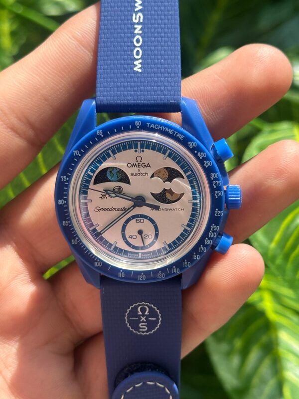 This is the Omega x Swatch MoonSwatch “Mission to Neptune”, part of the collaborative Speedmaster collection. It features a striking deep-blue bioceramic case, matching strap, and detailed chronograph dial inspired by Omega’s iconic Moonwatch design. Stylish, lightweight, and collectible, it blends space heritage with modern affordability.