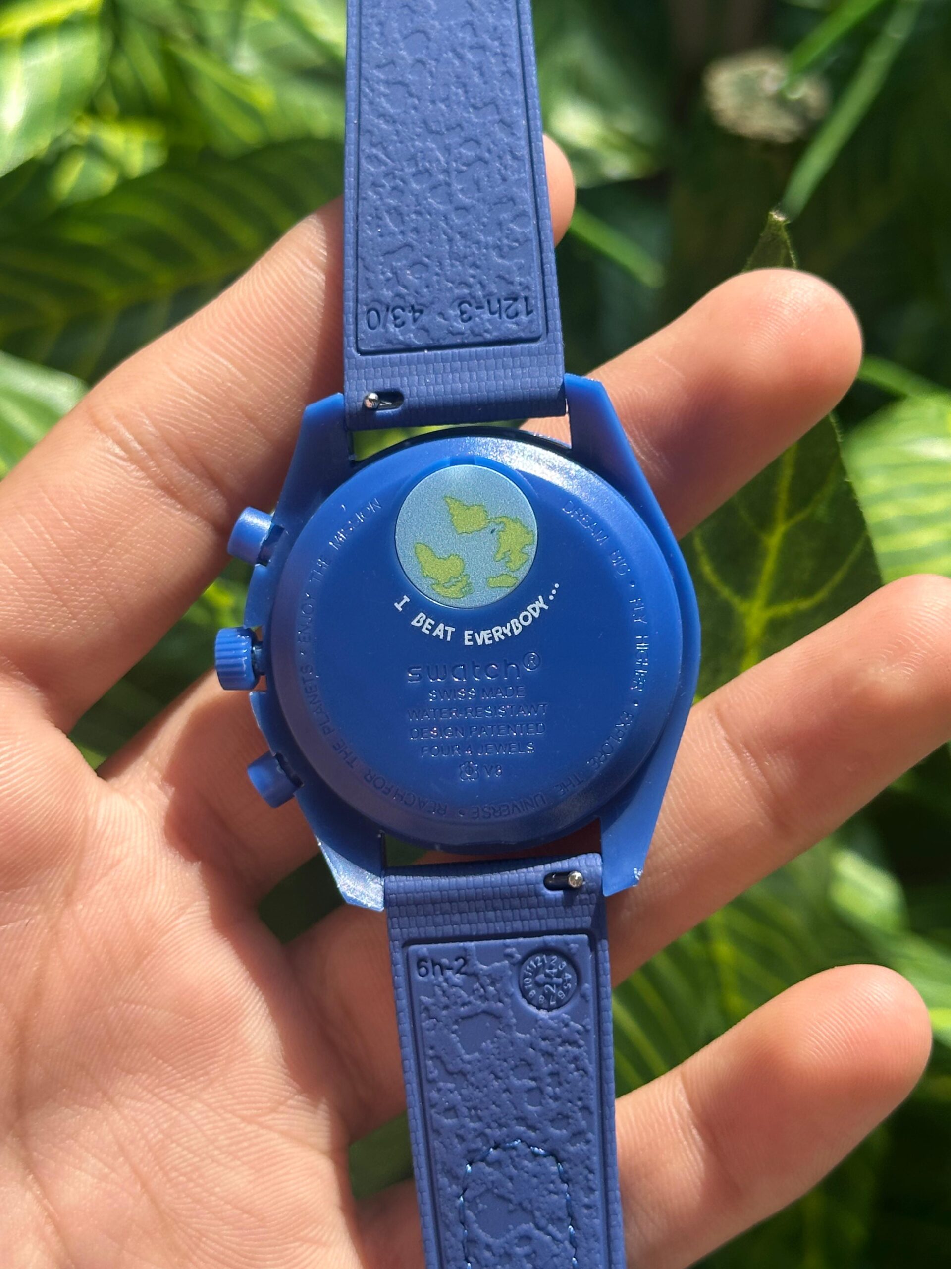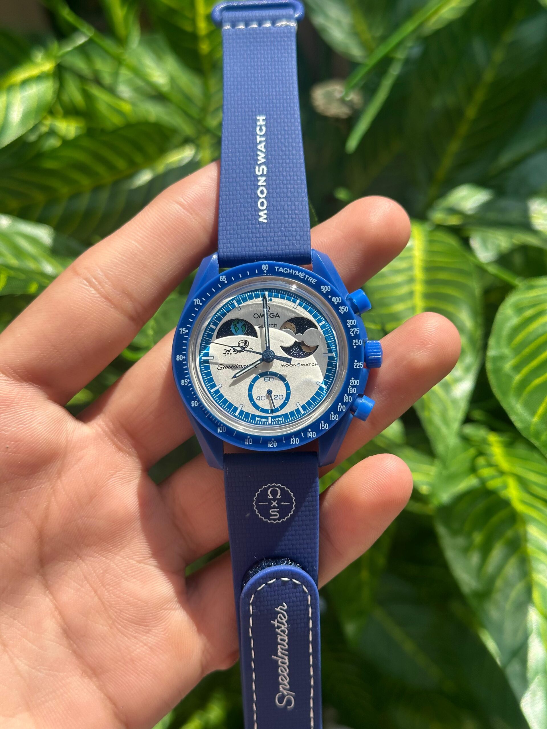 This is the Omega x Swatch MoonSwatch “Mission to Neptune”, part of the collaborative Speedmaster collection. It features a striking deep-blue bioceramic case, matching strap, and detailed chronograph dial inspired by Omega’s iconic Moonwatch design. Stylish, lightweight, and collectible, it blends space heritage with modern affordability.